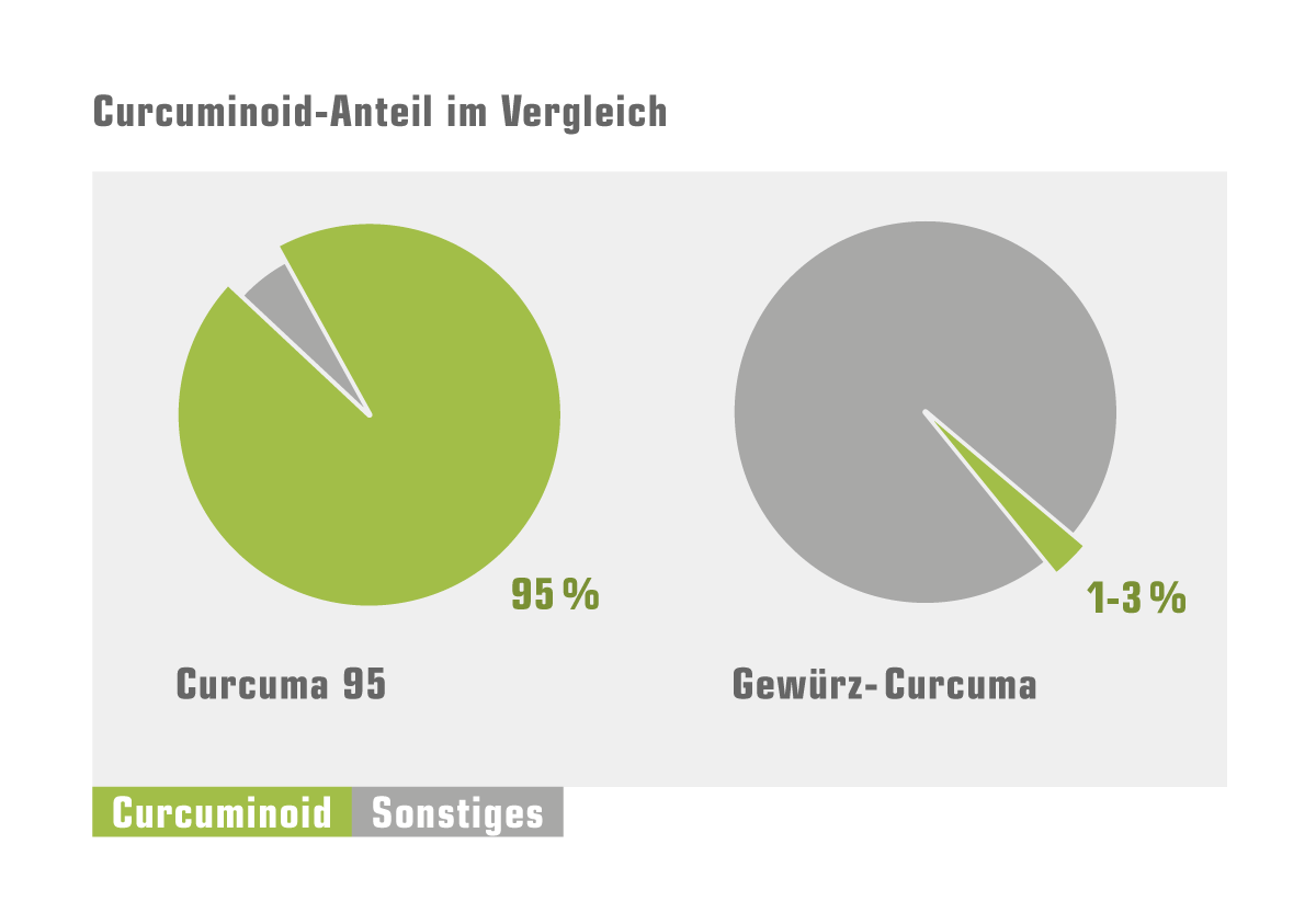 - der hochkonzentrierte Kurkuma -Extrakt in Curcuma 95 ist 30-40 mal konzentrierter als herkömmliches Kurkuma -Gewürz – man müsste also äußerst viel Kurkuma täglich in sein Essen kippen für einen ähnlichen Effekt
